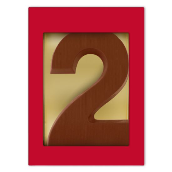 Een chocolade cijfer nummer 2 gemaakt van 80 gram overheerlijke melkchocolade. Wij werken uitsluitend met duurzaam geproduceerde Cocoa Horizons chocolade van het Belgische chocolademerk Barry Callebaut. Het chocolade cijfer wordt verpakt in een mooie rode geschenkdoos.