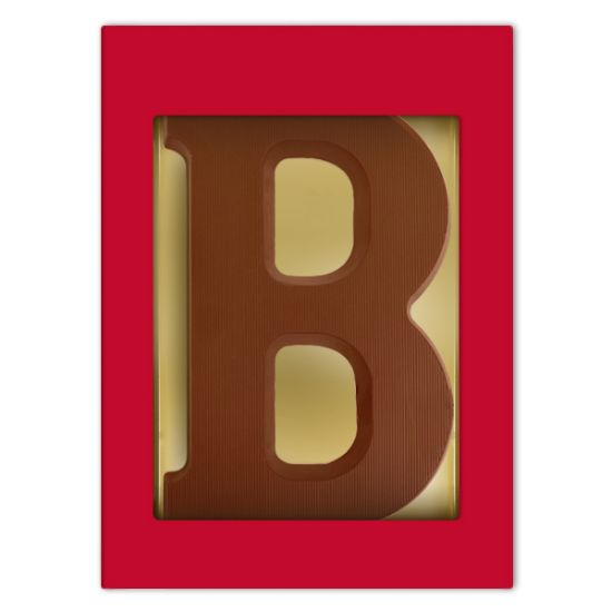 Een mooie luxe rode geschenkdoos voorzien van een chocoladeletter B melk. De letter weegt 175 gram en wordt gemaakt van duurzame chocolade van het Belgische Chocolademerk Barry Callebaut.