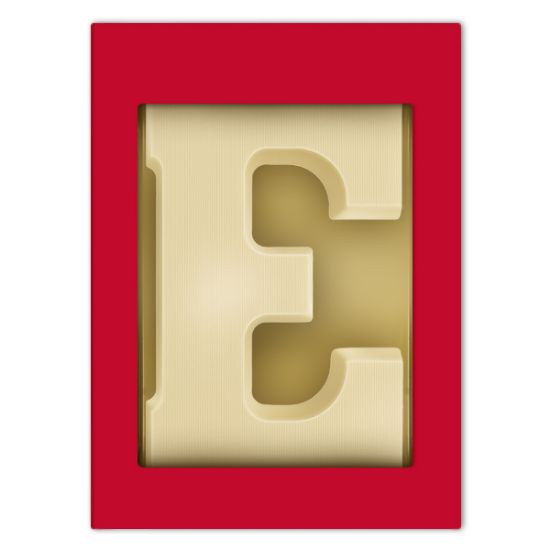 Een witte chocoladeletter E (200 gram) verpakt in een luxe rode geschenkdoos. De chocoladeletters van ChocoABC worden gemaakt van Belgische duurzaam geproduceerde Cocoa Horizons chocolade van het chocolademerk Barry Callebaut.