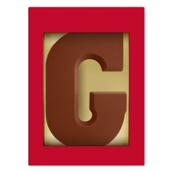 Een mooie luxe rode geschenkdoos voorzien van een melkchocoladeletter G. De letter weegt maar liefst 200 gram en wordt gemaakt van duurzame chocolade van het Belgische Chocolademerk Barry Callebaut.