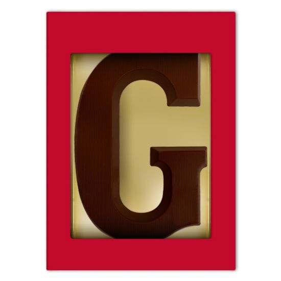Een mooie luxe rode geschenkdoos voorzien van een chocoladeletter G puur. De letter weegt 175 gram en wordt gemaakt van duurzame chocolade van het Belgische Chocolademerk Barry Callebaut.
