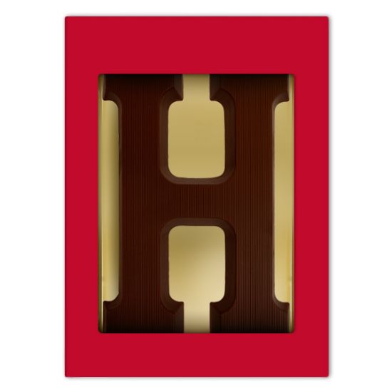 Een mooie luxe rode geschenkdoos voorzien van een chocoladeletter H puur. De letter weegt 175 gram en wordt gemaakt van duurzame chocolade van het Belgische Chocolademerk Barry Callebaut.