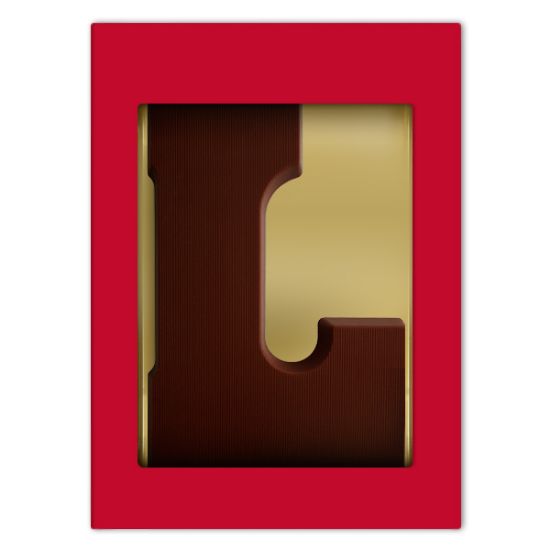 Een chocoladeletter L gemaakt van overheerlijke pure Belgische chocolade. De letter weegt 200 gram en wordt verpakt in een rode geschenkdoos. 100% Vegan!