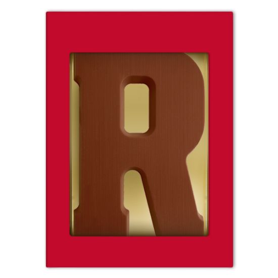 Een mooie luxe rode geschenkdoos voorzien van een melkchocoladeletter R. De letter weegt maar liefst 200 gram en wordt gemaakt van duurzame chocolade van het Belgische Chocolademerk Barry Callebaut.