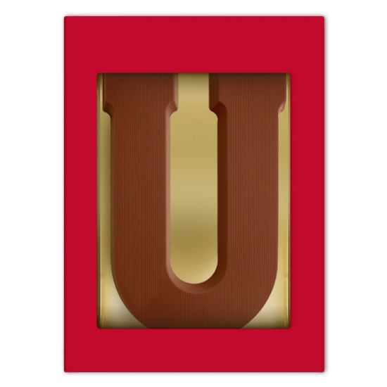 Een mooie luxe rode geschenkdoos voorzien van een melkchocoladeletter U. De letter weegt maar liefst 200 gram en wordt gemaakt van duurzame chocolade van het Belgische Chocolademerk Barry Callebaut.