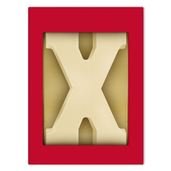 Een witte chocoladeletter X (200 gram) verpakt in een luxe rode geschenkdoos. De chocoladeletters van ChocoABC worden gemaakt van Belgische chocolade van het chocolademerk Barry Callebaut.