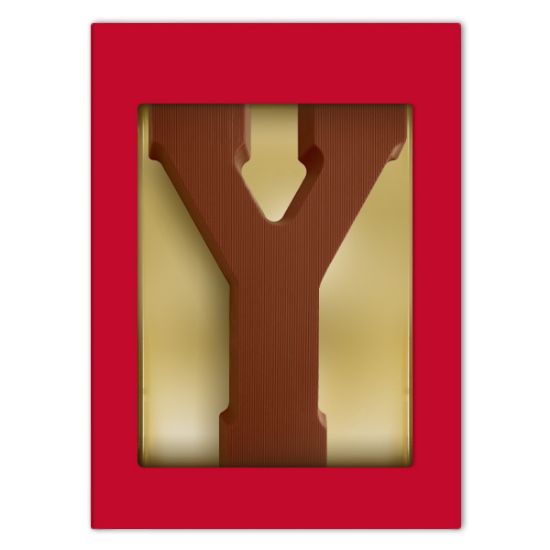 Een mooie luxe rode geschenkdoos voorzien van een melkchocoladeletter Y. De letter weegt maar liefst 200 gram en wordt gemaakt van duurzame chocolade van het Belgische Chocolademerk Barry Callebaut.