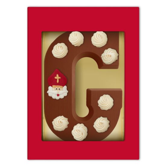 Deze luxe chocoladeletter G is opgespoten met een heerlijke chocoladedecoratie en voorzien van een vrolijke sinterklaas afbeelding. Deze luxe chocoladeletter wordt verpakt in een fraaie vensterdoos. Een mooi chocoladecadeau om te geven, een heerlijk chocoladecadeau om te krijgen.