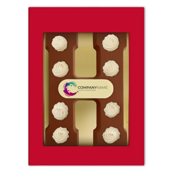 De letter H is opgespoten met chocolade decoraties, die het luxe karakter van het geschenk onderstrepen en wordt verpakt in een fraaie vensterdoos. De chocoladeletter H is opgelegd met jouw gepersonaliseerd logoschild.