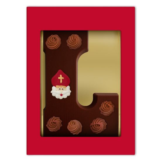 Deze luxe chocoladeletter L is opgespoten met een heerlijke chocoladedecoratie en voorzien van een vrolijke sinterklaas afbeelding. Deze luxe chocoladeletter wordt verpakt in een fraaie vensterdoos. Een mooi chocoladecadeau om te geven, een heerlijk chocoladecadeau om te krijgen.