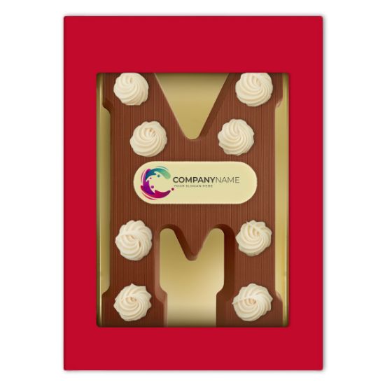 De letter M is opgespoten met chocolade decoraties, die het luxe karakter van het geschenk onderstrepen en wordt verpakt in een fraaie vensterdoos. De chocoladeletter M is opgelegd met jouw gepersonaliseerd logoschild.