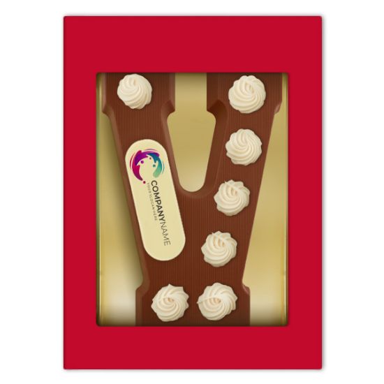 De letter V is opgespoten met chocolade decoraties, die het luxe karakter van het geschenk onderstrepen en wordt verpakt in een fraaie vensterdoos. De chocoladeletter V is opgelegd met jouw gepersonaliseerd logoschild.