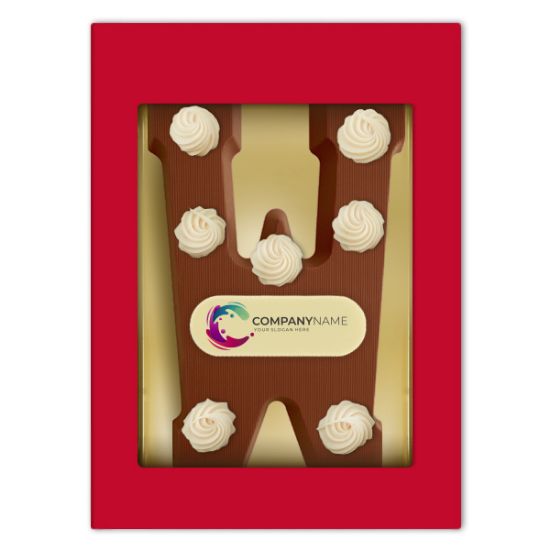 De letter W is opgespoten met chocolade decoraties, die het luxe karakter van het geschenk onderstrepen en wordt verpakt in een fraaie vensterdoos. De chocoladeletter W is opgelegd met jouw gepersonaliseerd logoschild.