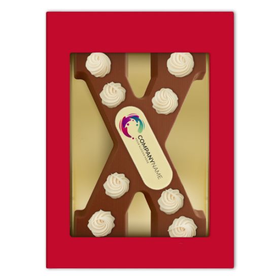 De letter X is opgespoten met chocolade decoraties, die het luxe karakter van het geschenk onderstrepen en wordt verpakt in een fraaie vensterdoos. De chocoladeletter X is opgelegd met jouw gepersonaliseerd logoschild.