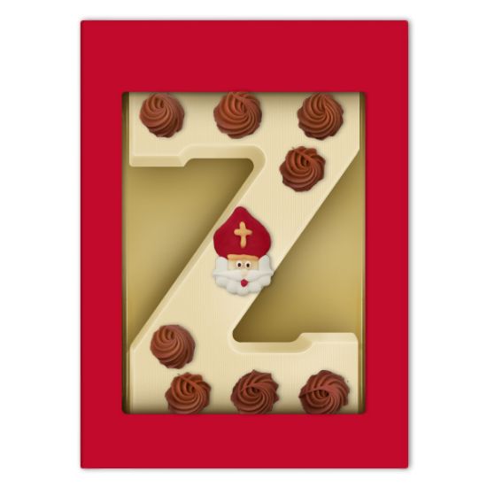 Deze luxe chocoladeletter Z is opgespoten met een heerlijke chocoladedecoratie en voorzien van een vrolijke sinterklaas afbeelding. Deze luxe chocoladeletter wordt verpakt in een fraaie vensterdoos. Een mooi chocoladecadeau om te geven, een heerlijk chocoladecadeau om te krijgen.