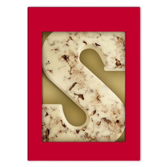 Deze chocoladeletter met cookie fudge vulling wordt beschreven als hemels. Wanneer je aan deze letter begint, kan je waarschijnlijk niet meer stoppen totdat alles op is! Durf jij het aan? Melkchocolade Cookie Fudge rotsjes zijn de basis voor deze chocoladeletter. De letter S cookie fudge is voor een extra smaaksensatie nog overtrokken met een laagje witte chocolade. Het geheel wordt verpakt in een rode vensterdoos.