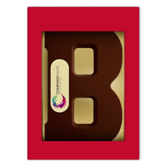 Jouw foto, bedrijfslogo of persoonlijke wenstekst op een pure chocolade letter B, d.m.v. een marsepeinen schildje (7 x 2,5 cm). De pure letter weegt 200 gram, wordt verpakt in een luxe rode geschenkdoos en is gemaakt van Belgische duurzaam geproduceerde Cocoa Horizons chocolade.