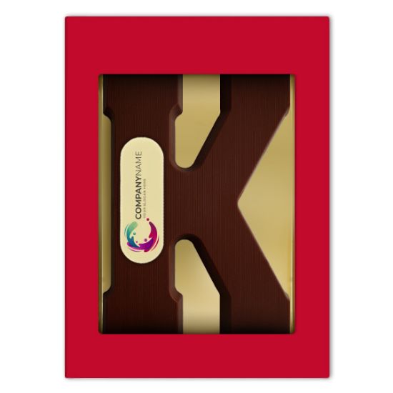 Jouw foto, bedrijfslogo of persoonlijke wenstekst op een pure chocolade letter K, d.m.v. een marsepeinen schildje (7 x 2,5 cm). De pure letter weegt 200 gram, wordt verpakt in een luxe rode geschenkdoos en is gemaakt van Belgische duurzaam geproduceerde Cocoa Horizons chocolade.