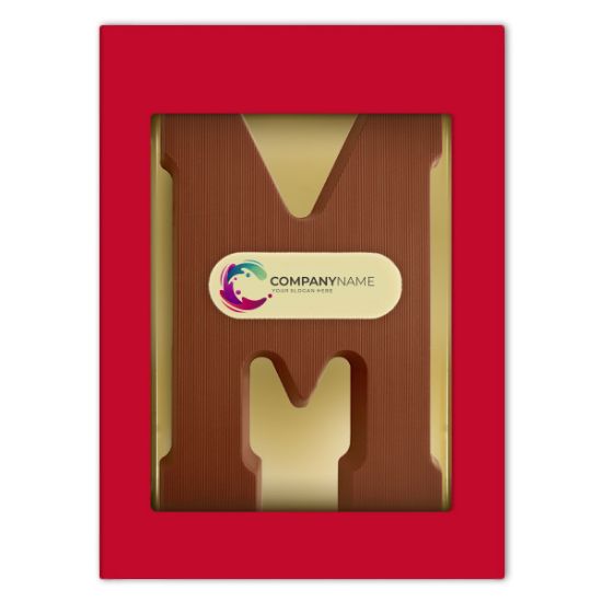 Een chocoladeletter verrassing met bedrijfslogo, de naam van de medewerker of zelfs allebei! De melkchocolade M letter weegt 200 gram en wordt voorzien van jouw persoonlijke marsepeinen schildje. Het marsepeinen schildje heeft een formaat van 7 x 2,5 cm.