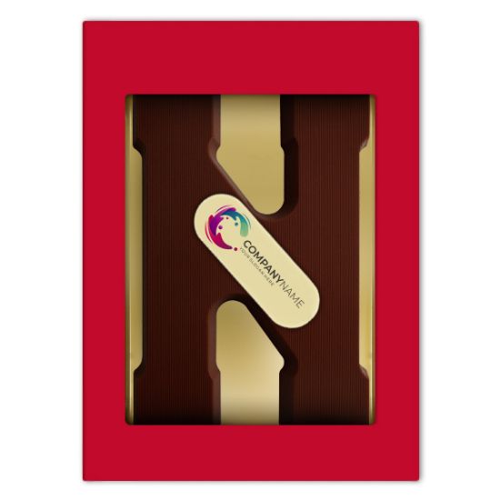 Jouw foto, bedrijfslogo of persoonlijke wenstekst op een pure chocolade letter N, d.m.v. een marsepeinen schildje (7 x 2,5 cm). De pure letter weegt 200 gram, wordt verpakt in een luxe rode geschenkdoos en is gemaakt van Belgische duurzaam geproduceerde Cocoa Horizons chocolade.