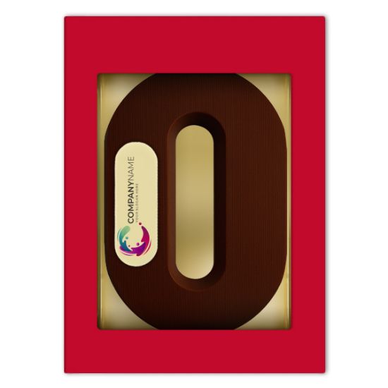 Jouw foto, bedrijfslogo of persoonlijke wenstekst op een pure chocolade letter O, d.m.v. een marsepeinen schildje (7 x 2,5 cm). De pure letter weegt 200 gram, wordt verpakt in een luxe rode geschenkdoos en is gemaakt van Belgische duurzaam geproduceerde Cocoa Horizons chocolade.