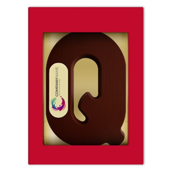 Jouw foto, bedrijfslogo of persoonlijke wenstekst op een pure chocolade letter Q, d.m.v. een marsepeinen schildje (7 x 2,5 cm). De pure letter weegt 200 gram, wordt verpakt in een luxe rode geschenkdoos en is gemaakt van Belgische duurzaam geproduceerde Cocoa Horizons chocolade.