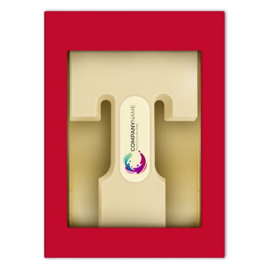 De witte chocoladeletter T van maar liefst 200 gram, voorzien van een marsepeinen schildje (7 x 2,5 cm) met jouw wenstekst of logo. De logoletter T wit is te bestellen vanaf 10 stuk en wordt per stuk verpakt in een mooie rode vensterdoos.