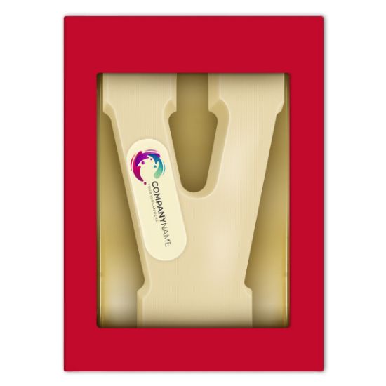 De witte chocoladeletter V van maar liefst 200 gram, voorzien van een marsepeinen schildje (7 x 2,5 cm) met jouw wenstekst of logo. De logoletter V wit is te bestellen vanaf 10 stuk en wordt per stuk verpakt in een mooie rode vensterdoos.