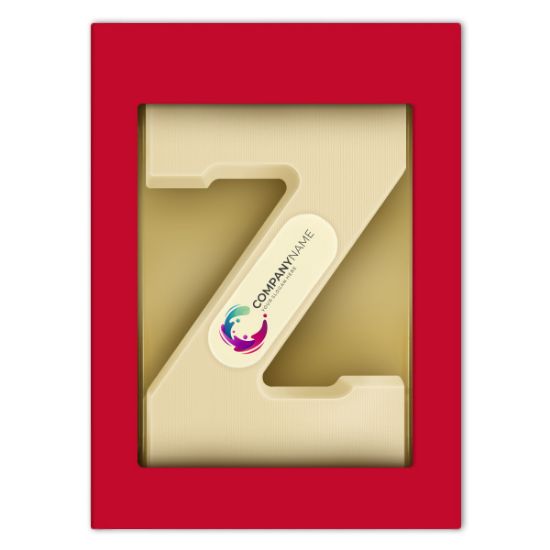 De witte chocoladeletter Z van maar liefst 200 gram, voorzien van een marsepeinen schildje (7 x 2,5 cm) met jouw wenstekst of logo. De logoletter Z wit is te bestellen vanaf 10 stuk en wordt per stuk verpakt in een mooie rode vensterdoos.