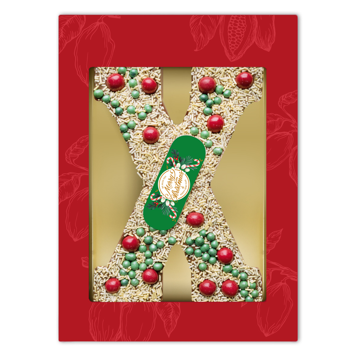 Een luxe vormgegeven X, in de Engelstalige landen het synoniem van Kerstmis. Mooi gedecoreerd met sprinkeldip. Een lust voor het oog, een lust voor de mond. Merry X-mas gewenst, op een bijzondere manier.